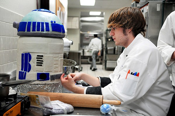 A.J. Schnetter puts some touches on an eight-layer R2D2 cake that will be more than three tall when itÕs done. Schnetter has been working on the Star Wars cake for the last two weeks as part of Flathead Valley Community CollegeÕs culinary program. As part of this yearÕs curriculum, 13 students are making cakes that have nowhere to go. ÒWeÕll auction any of them off,Ó said Chef Hillary Ginepra, the program instructor. ÒThese are their first cakes. These are pretty impressive for people who have never done this before.Ó Anyone interested in the classÕs made-from-scratch cakes can call Chef Hillary at 756-3862.