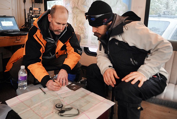 Gary Presson, left, and Rob Brenneke of the Flathead County Mountain Rescue team talk about map and compass readings Thursday morning during the search a missing skier in Jewel Basin. The skier's body later was found buried by an avalanche.