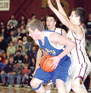 Nolan Broden in the key jockeys for position with Gabe Hickman on guard during first quarter.