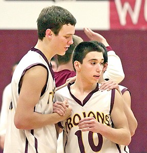 Justin Randall, left, congratulates Cody Orr for scoring the go-ahead hoop to put Troy up 43-42 to win the game.