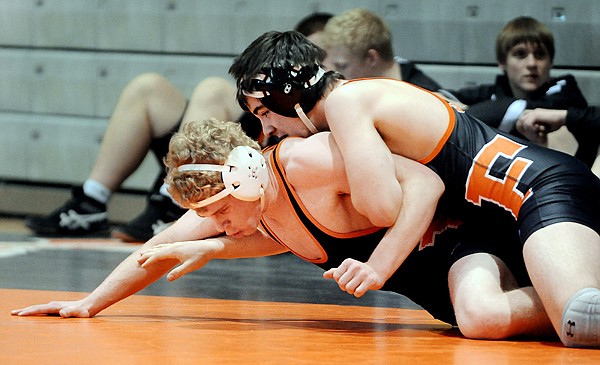 Flathead’s Nick Iavicoli (top) rides teammate Brock Steller during a 160-pound match on Friday evening at Flathead High School. Iavicoli won with a pin.