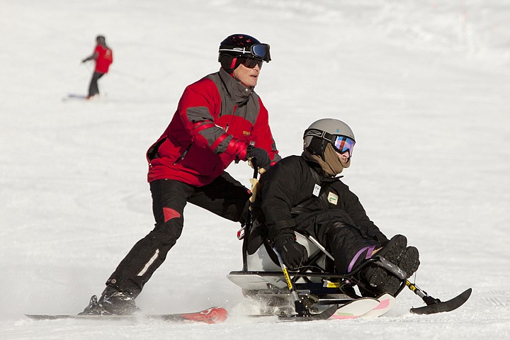 With ski instructor Andy Pollard, left, close behind, Staff Sergeant Tom Rollason skis down Chipmunk run in a sit-ski at Whitefish Mountain Resort Friday morning as part of the Wounded Warrior program. Rollason, who has served in both the Navy and Army, was injured by an IED in September of 2009.