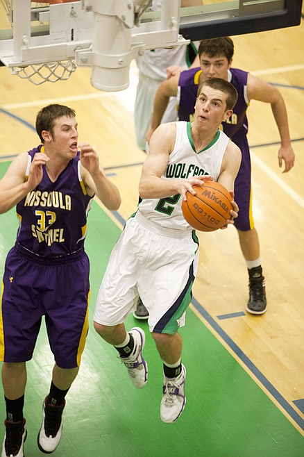 With the Pack up 14 with two minutes to play in the half, Sentinel's Derek Colberg nailed a 3-pointer, which was quickly followed by a free throw and a steal and basket, cutting Glacier's lead to just 28-20, until Sean Peters was able to get to the free-throw line, ending the half with a 29-20 Wolfpack lead.