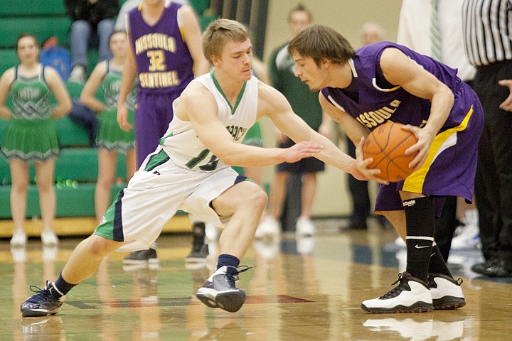 Wolfpack sophomore Evan Epperly (left) tries to steal the ball from Missoula's Alec Bray during Glacier's home matchup against Missoula Sentinel on Tuesday night.
