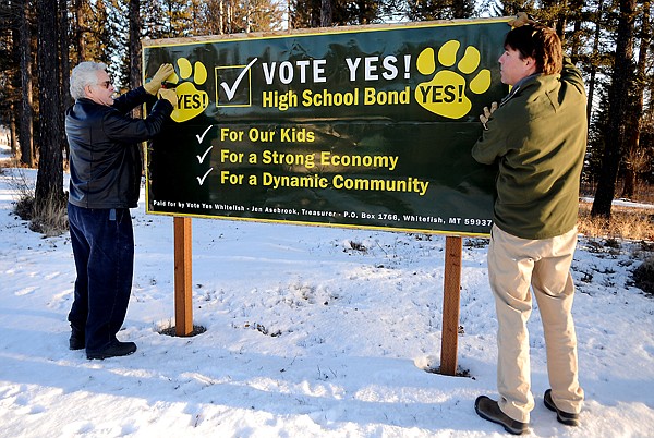 Turner Askew, left, and John Muhlfeld work together Tuesday to put up a sign supporting the Whitefish High School bond request. The sign was installed near the intersection of U.S. 93 and Montana 40. Muhlfeld defeated Askew last year in the election for Whitefish mayor.