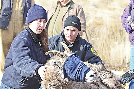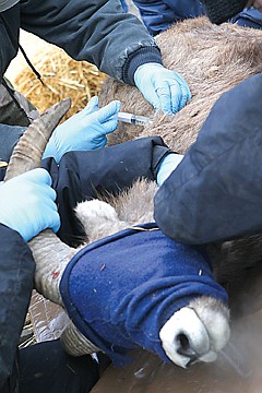 After capture, the sheep were tied to the helicopter and transported to Big Arm State Park where wildlife veterinarians swarmed, taking blood samples to check for viruses, nasal swabs for mycoplasma and mannheimia (associated with pneumonia) and fecal samples to look for intestinal parasites. The process may seem intrusive, but according to Jennifer Ramsey, a wildlife veterinarian from the Wildlife Health Lab in Bozeman, the extensive health tests are routine when moving animals.