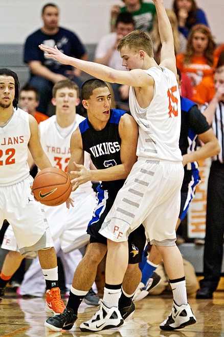 Luke Thoreson scored a team-high 11 points to lead the Post Falls Trojans past the Coeur d'Alene Vikings in the 5A Inland Empire League finale for both schools Wednesday night at The Arena.