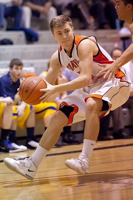 Drew Crosby of Flathead makes a jump stop during a drive against a Missoula Big Sky defender Friday night at Flathead High School.