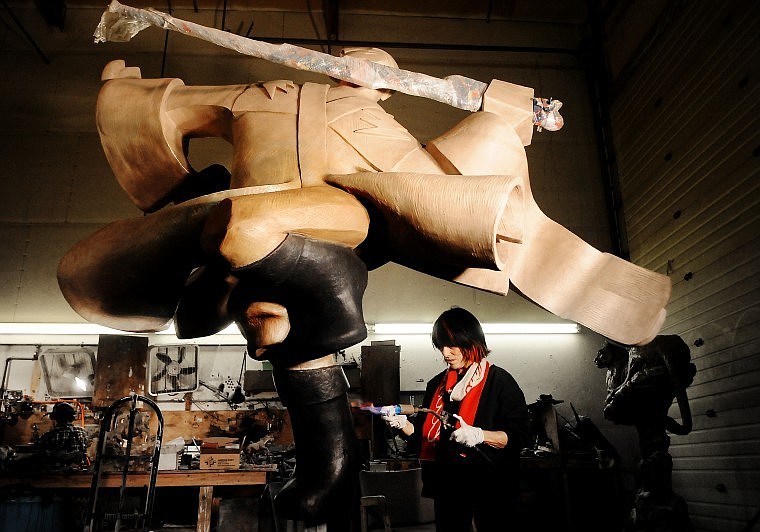 Artist Nina Winters applies the patina to her sculpture Galactic Samuri on Monday, February 6, at Kalispell Art Casting.