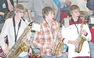 The baritone and alto saxophones of Troy Pep Band members Jeremy Helmrick, left, Gage Tallmadge and Nathan Olds kept the crowd fired up during Friday's match-up with the Stillwater Christian Cougars.