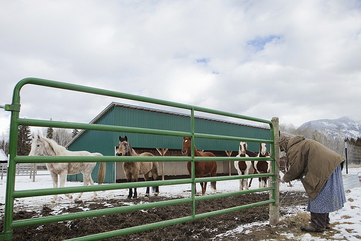 Several horses that are up for adotion watch as Virginia Carter closes a gate on her ranch in Ferndale Tuesday afternoon.