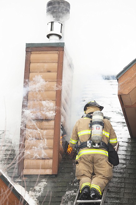 Whitefish firefighter Cole Lackey exposes open flames in a chimney fire Wednesday morning at 210 JP Road in Whitefish.