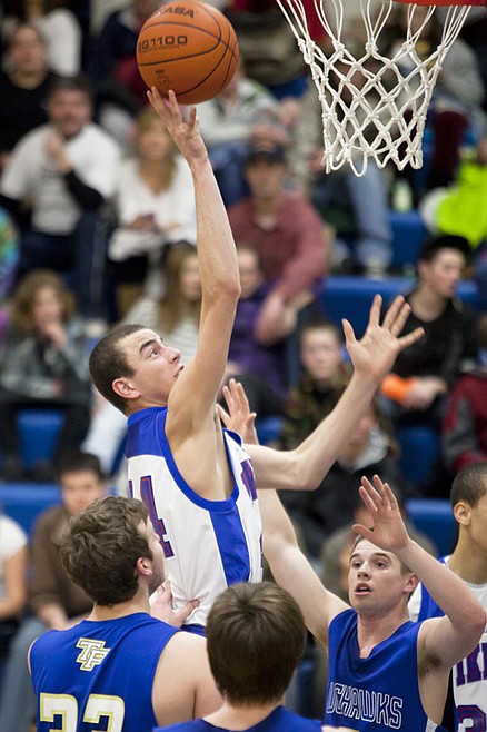 Bigfork's Jackson Boese (center) puts up a shot in the fourth quarter of Bigfork's victory over Thompson Falls in the Class 7B tournament at Bigfork High School Thursday night. Thursday, Feb., 16, 2012 in Bigfork, Mont.
