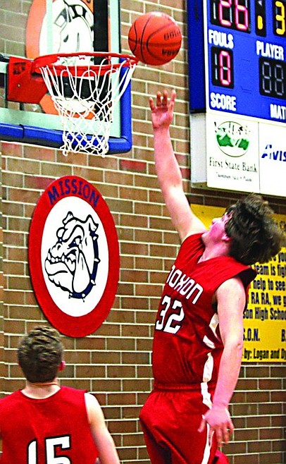 Jordan Eichert of Noxon (32) tipping in the easy basket with Brandon Pizzola (bottom) looking on.