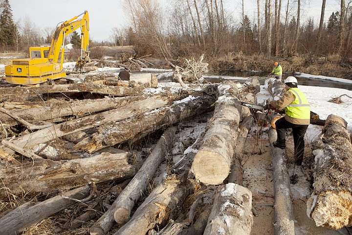 As an excavator removes debris and trees from a log jam on the Stillwater River, Flathead County Road and Bridge workers use chainsaws to cut the larger logs into smaller pieces Thursday morning. The log jam is being removed to help prevent flooding as well as make the river safer for recreational use.