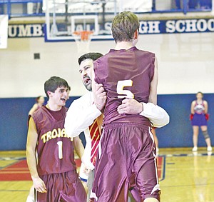 Ryan Rayson gets a triumphant hug from Coach Corey Andersen after defeating Bigfork 38-36 Saturday for the 7-B District Championship
