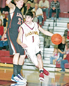 Senior guard Creede Garcia drives the lane past Eureka's 6'5" Tanner Peterson in 4th quarter action vs. Eureka Thursday