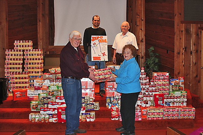 Sheri McDonald, Bread Basket director, visited the church where the 2,200 cans of soup were piled high in front of the pulpit.