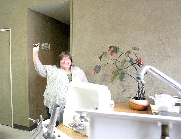 With the sinks gotten from Habitat For Humanity to replace the old ones in the Hot Springs Town Hall, Anna Marie Ferguson holds a paint brush high after having completed most of the renovation Monday at Town Hall.