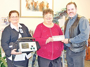 St. John’s Lutheran Hospital Auxiliary President Jan Kendall hands a check to Steve Chavez, Hospital CFO for $5,000 toward the purchase of a ZOLL patient monitor, which will be used in the transport of critical patients to other healthcare facilities. Cathy Wolfe, Vice President of Nursing Services at SJLH stands by with the new equipment, which is the top of the line in Monitor Defibrillators.