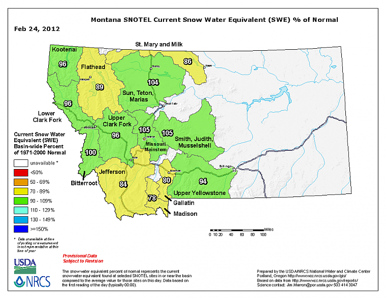 The Bitterroot is right on target at 100 percent of normal, while in the southwest the Madison and Gallatin are lagging at 78 and 80 percent, respectively.