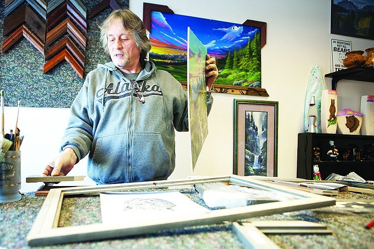 Wayne Mosbarger frames one of his paintings at the Smoke Haus Emporium in Evergreen Wednesday morning.