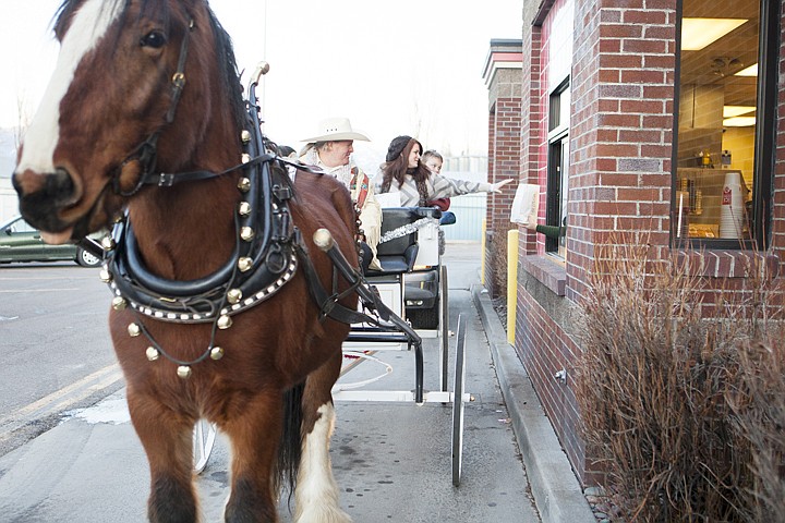 Trinity Williams reaches from horse-drawn carriage for a bag of food at the Wendy's drive through in Evergreen Monday evening. Sunny, the four-year-old Clydesdale, pulled the family from their house off of Helena Flats.