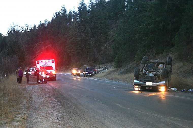 Plains EMT and Plains-Paradise Rural Fire Department speak with accident victim Jan.4 following her rollover accident due to icy roads on River Road West in Plains.