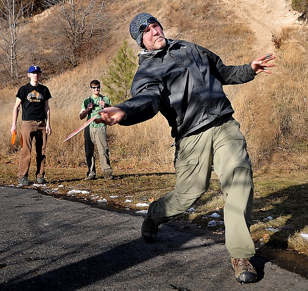 Rich Johnson of Eureka, front, plays Frisbee golf with his son Tim Johnson of Kalispell and Vitaliy Gerasimov of Eureka on Wednesday afternoon at Lawrence Park. Wednesday’s high temperature of 50 degrees set a new weather record; the previous record high for Jan. 4 was 47 degrees in 1902.