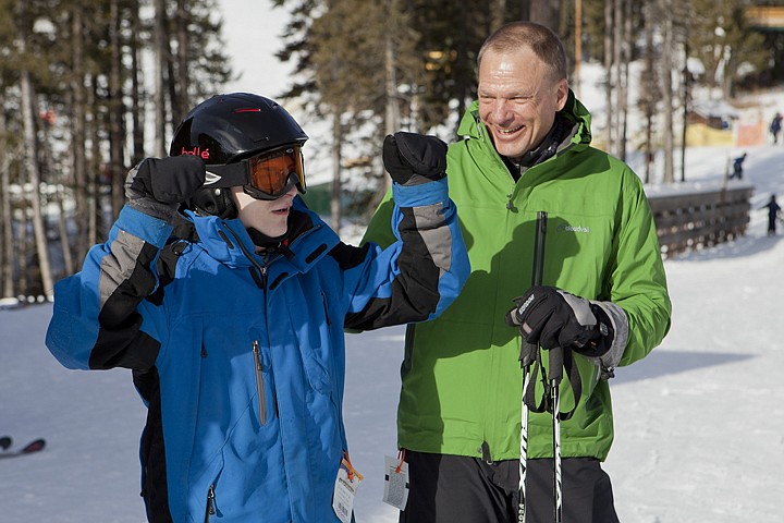 Randy Luken, right, jokes around with Erik Greene at Whitefish Mountain Resort Wednesday afternoon. As a DREAM Adaptive volunteer, Luken not only teaches regular classes but also helps people like Greene who are at the mountain on vacation.