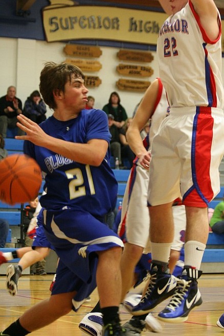 Garrett Reinschmidt of Thompson Falls (21) looking for an open man with Zach Benda of Superior blocking his way.