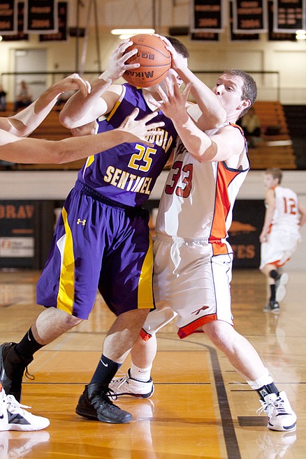 Flathead’s Austin Jones (33) reaches in on Missoula Sentinel’s Nathan Jewett (25).