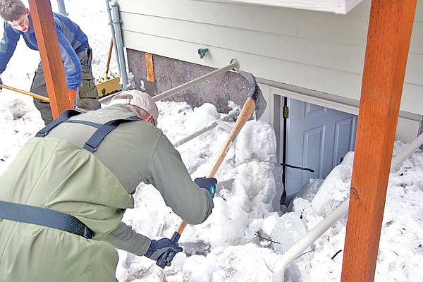 Dr. Jay Maloney and his son Cree dig through the ice and snow that buried the basement entrance to Randy Wiza's house on Nevada Avenue. When the ice jam broke up, it threw chunds into Wiza's yard and filled his basement with water.