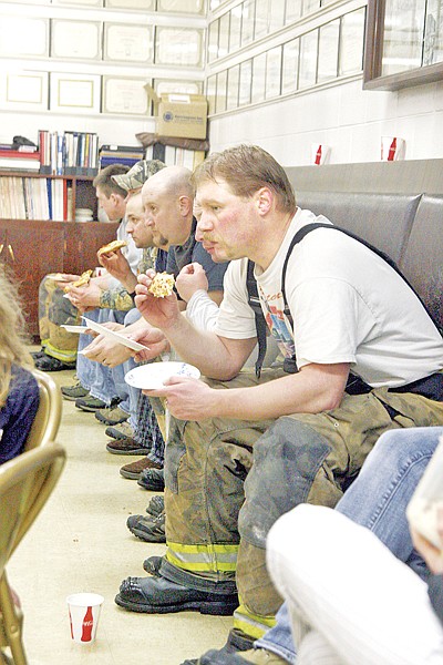 Jason Place, front, and other Libby volunteer firefighters take a pizza break at the fire hall at noon Monday after the flooding began to subside.