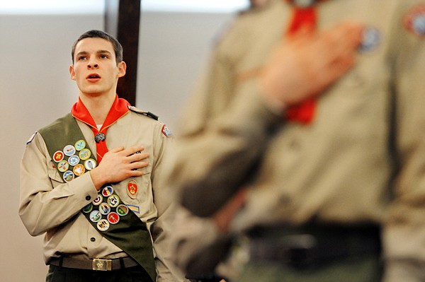 Michael Reimer sings along with the National Anthem at the start of his Eagle Scout ceremony Dec. 30 at the Whitefish Church of the Nazarene. Michael is the youngest of four brothers, all of whom have attained the rank of Eagle Scout.