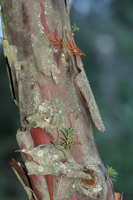 Since yews are not large trees, they are often stumbled upon when wandering through the woods. Sometimes yews do not even resemble a tree. They can grow as a gangly shrub hugging the ground or grow upright to approximately 49 feet. The trunks are often twisted or curved with straight trunks being rare. Regardless of the small trunk, yew wood is hard, heavy and resistant to decay. The thin, reddish-purple bark flakes off in long, papery scales revealing the inner rose-colored bark.