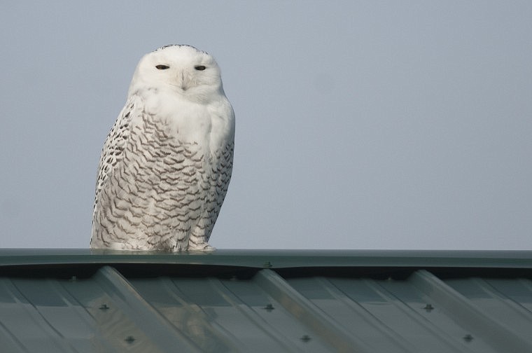 A snowy owl perches on top of a barn roof near Mission View Drive at the south edge of Polson.