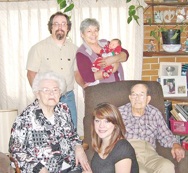 With the recent birth of Kory Peltier, his family gathered for a five-generations photograph. Those family members include Matt McLain of Libby, standing, who is Kory’s grandfather, Barb Robbins of Kalispell, who is the great-grandmother holding Kory. Sitting at left is Jean Struck of Libby, who is the great-great-grandmother, Kelsey McLain of Libby, who is Kory’s mother and Truman Struck of Libby, who is Kory’s great-great-grandfather.