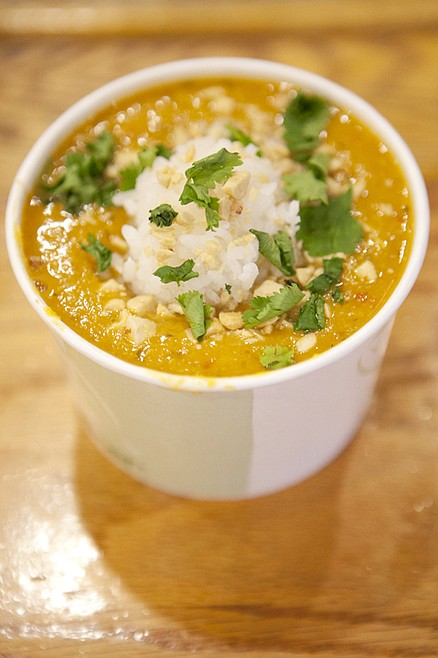 The Thai Chicken soup at Cafe Max Soup Co. includes rice and is topped with cilantro.