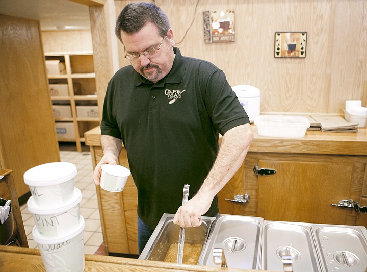 Steve Murray, owner of Cafe Max Soup Co., scoops out a bowl of Thai chicken soup at the new restaurant in Whitefish on Wednesday evening.