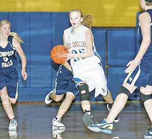 Sophomore guard Kelsey Klin runs a gauntlet of blue as she brings the ball down court in the fourth quarter during Thursday's contest with T-Falls.