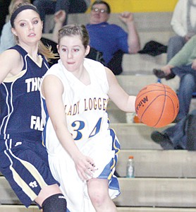 Sophomore Taylor Quinn heads for the key with T-Falls' Kelsey Fitchett in tow during fourth quarter action Thursday evening.