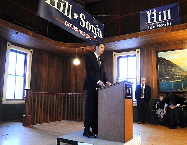 Jon Sonju speaks to the crowd gathered at the Sassafras Ballroom on Wednesday morning after being introduced as the running mate for Republican gubernatorial candidate Rick Hill.