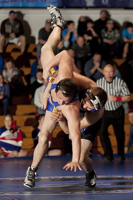 Libby’s Kyle Leir (left) sticks an arm out to break his fall while being taken down by Columbia Falls senior Kohl Thompson during their 145-pound match Thursday night at Columbia Falls.