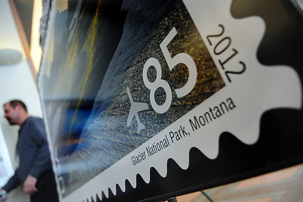 A visitor at the Glacier National Park Stamp First-Day-Of-Issue ceremony walks past an enlargement of the new international rate stamp Thursday afternoon in Kalispell. The stamp features a photograph of Logan Pass by National Geographic photographer Michael Melford and is part of the U.S. Postal Service’s Scenic American Landscapes series.