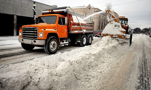 Works department vehicles clear a snow berm on First Avenue East on Friday morning in downtown Kalispell.