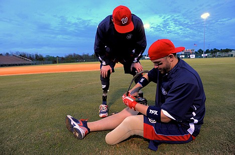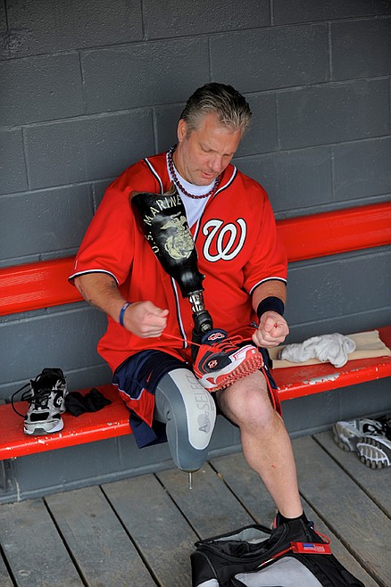 Brian Taylor Urruela, 26, is the catcher and one of the players who wears a curvy running leg. The former solider from St. Louis lost his right leg below the knee to a roadside bomb in Iraq in October 2006, two days before he was scheduled to finish his tour and come home. The former high school baseball player said it took hundreds of practice swings and other physical therapy work to develop his hitting again, but he figures he's nearly as fast on the prosthetic as he was before.