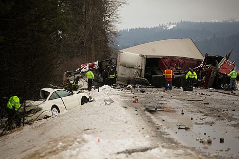 Brian M. Fendos, 39, of Bonners Ferry, was southbound in a 2004 Peterbilt tractor towing an empty gasoline tank trailer when Henager lost control, and took evasive measures to miss Henager as he went off the southbound shoulder. According to the ISP press release, Fendos struck a northbound 2005 Volvo semi tractor towing a livestock trailer driven by Pavlo P. Shevchuk, 21, of Manitoba, Canada. Shevchuk lost control and drove into a northbound ditch.