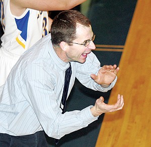 A jubilant Coach Wally Winslow over Kraig Nelson's three point play in the third quarter Friday vs T-Falls Bluehawks
