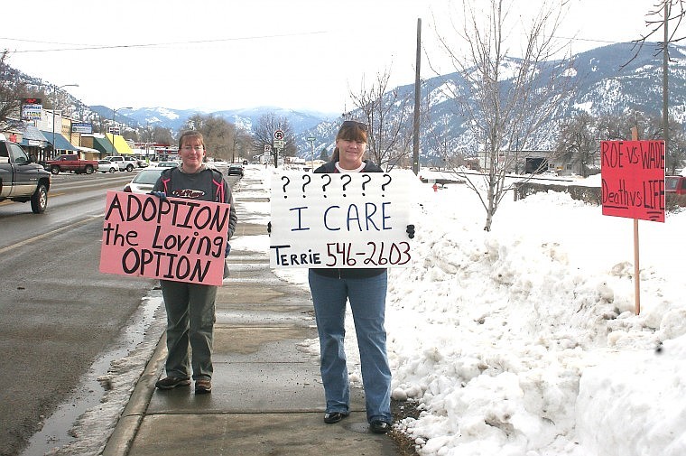 Local protestors Amy Stinnett (left) and Terrie Woods (right) hold signs Sunday afternoon in Plains on the main stretch in town.